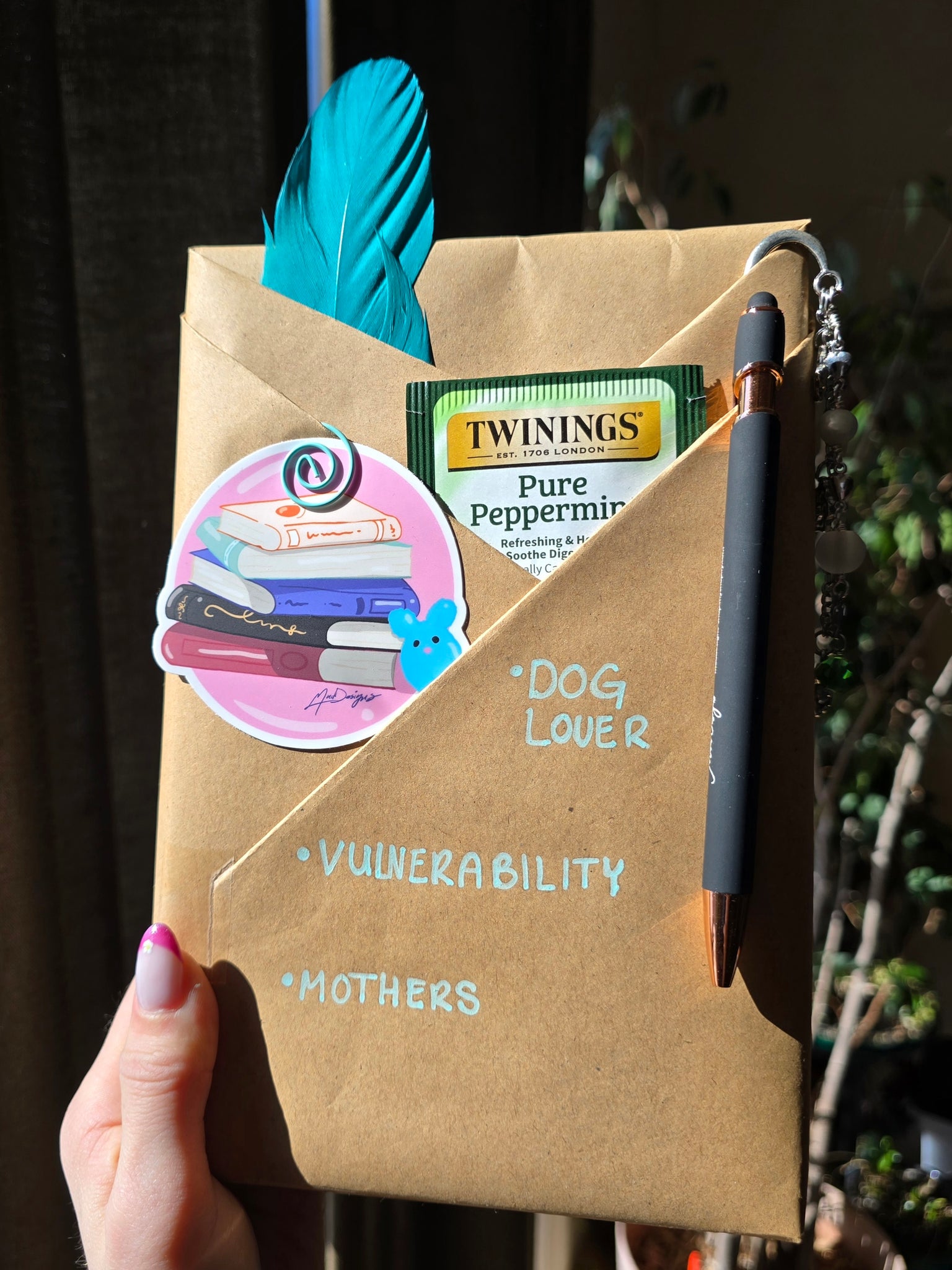 Pre loved books, with custom bookmark to match. Includes the following; a feather, tea, MadDesigns pen, and hand drawn sticker. Key words; Dog lover, Vulnerability, Mothers.