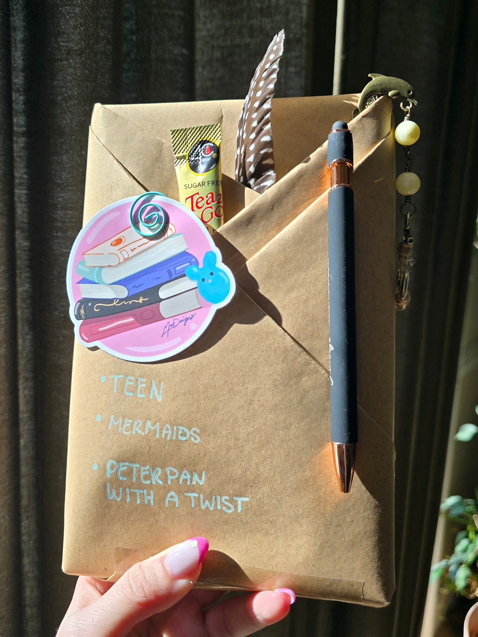 Pre loved books, with custom bookmark to match. Includes the following; a feather, tea, MadDesigns pen, and hand drawn sticker. Keywords: Teen, Mermaids, Peter Pan with a twist.