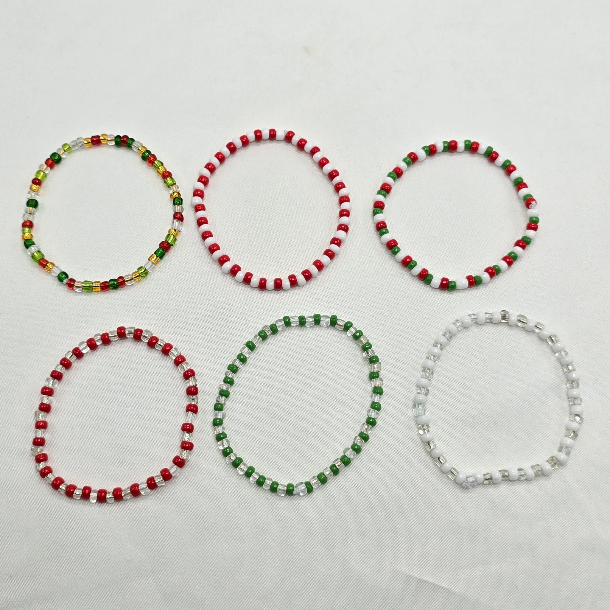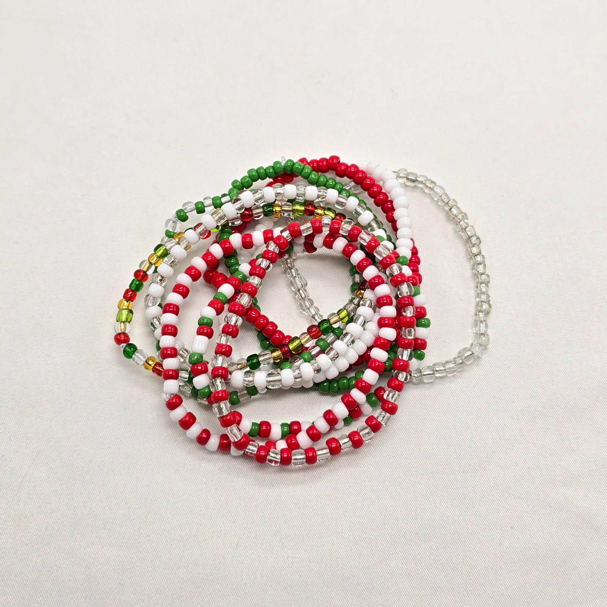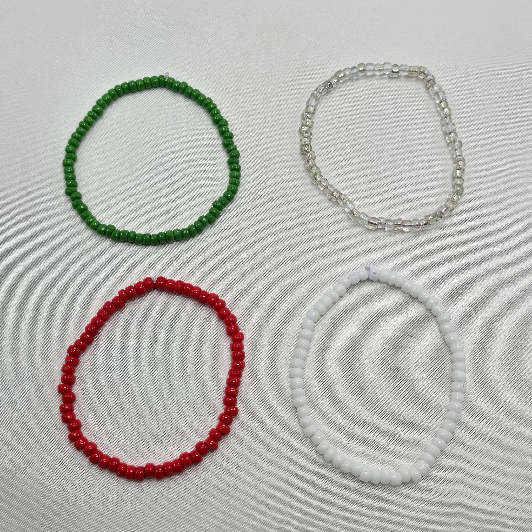 Christmas Bracelet Stack, Set of 10, assorted clear, green, red, yellow and white glass seed beads on white stretch cord(loose stretch) fits most average wrists