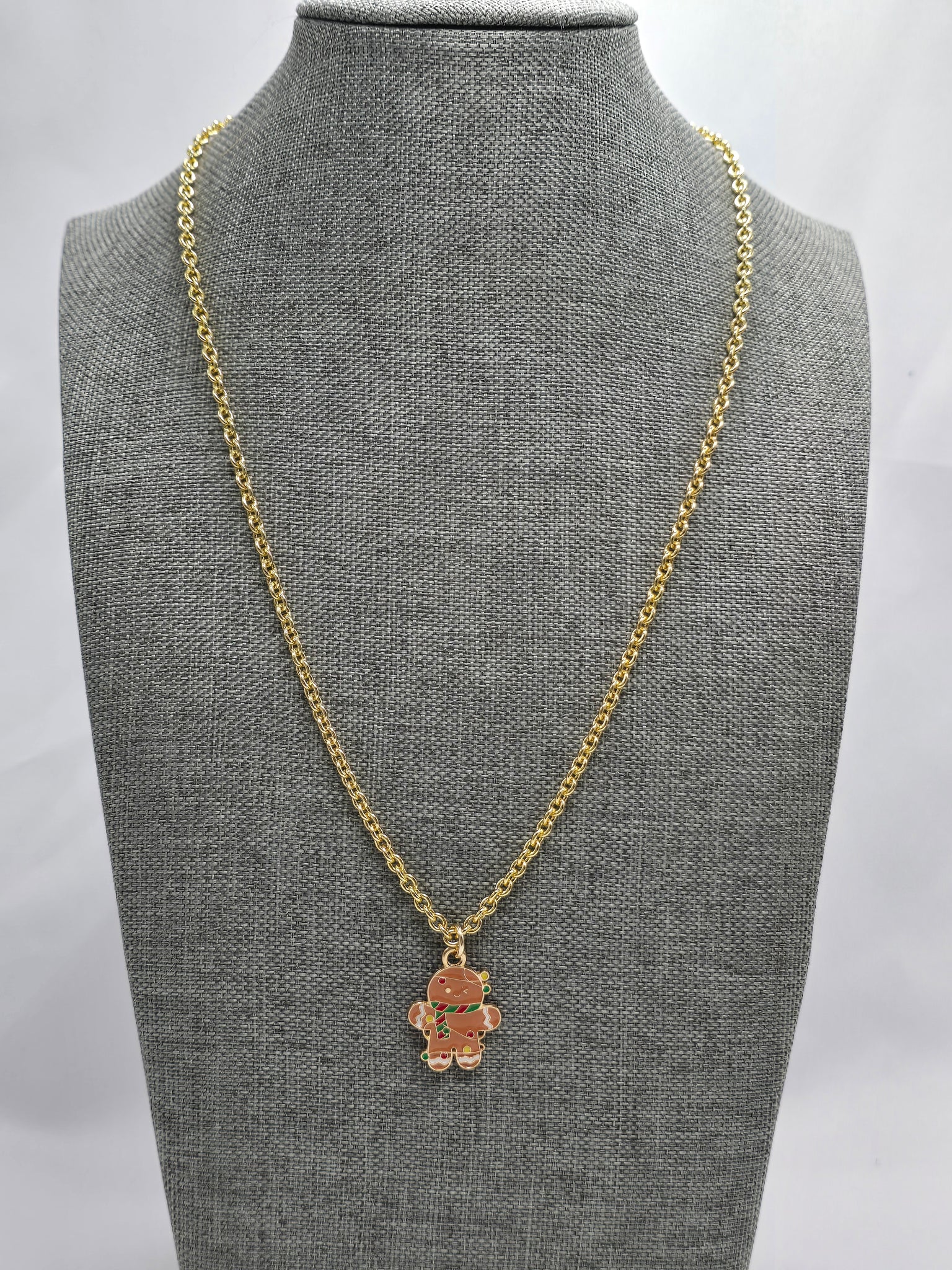 Gingerbread Man Enamel Necklace, 3/4" single sided enameled charm, metal alloy, lead free, nickel free, cadmium free on 3mm gold finished brass cable chain, gold plated brass lobster claw clasp, adjustable links to 19"