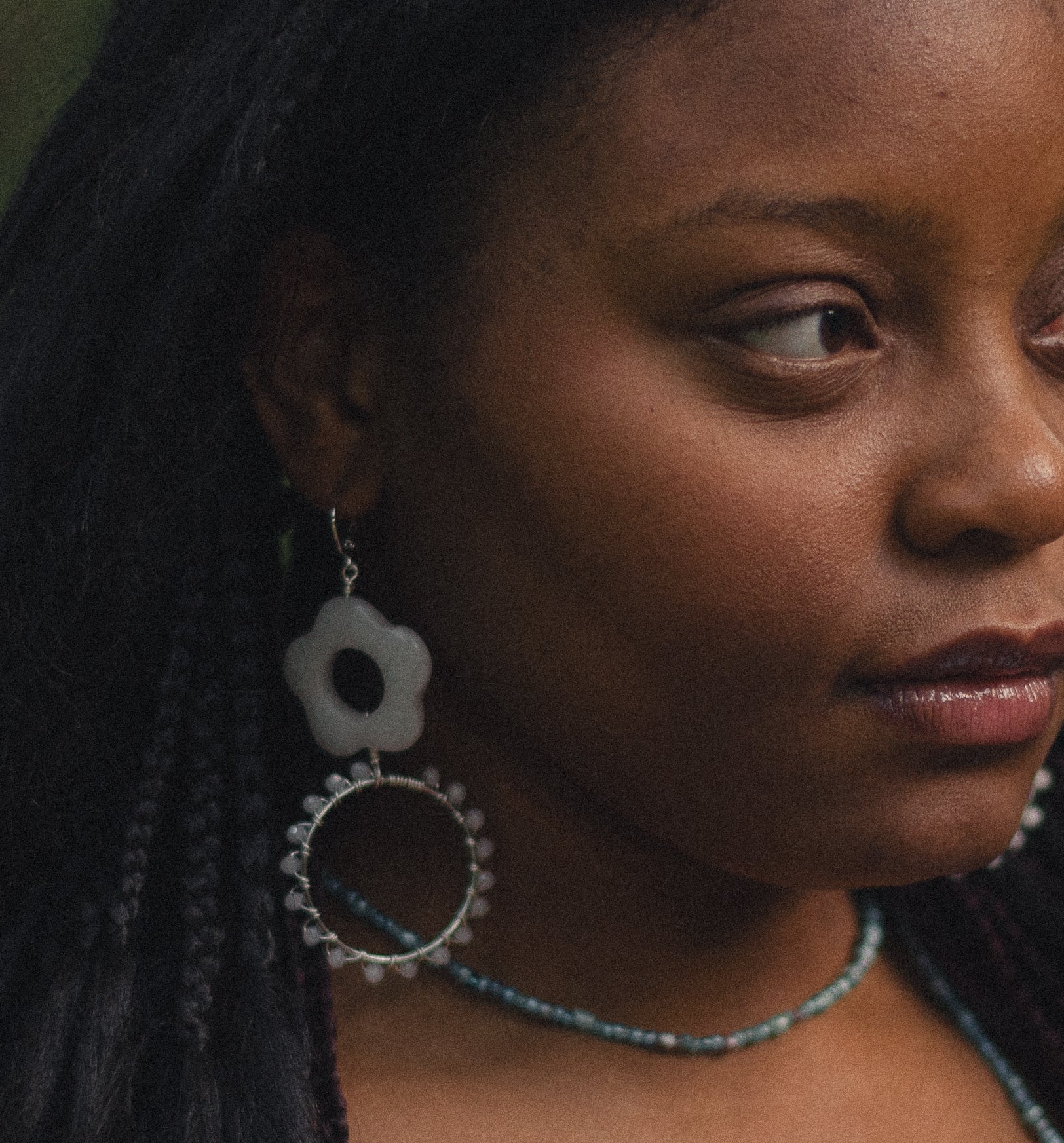 Ophelia Earrings, white jade flower with a hoop of hand wrapped faceted Czech crystals on hypoallergenic, tarnish resistant, round huggie hook, silver plated brass round leverback ear wire, 3 1/4"