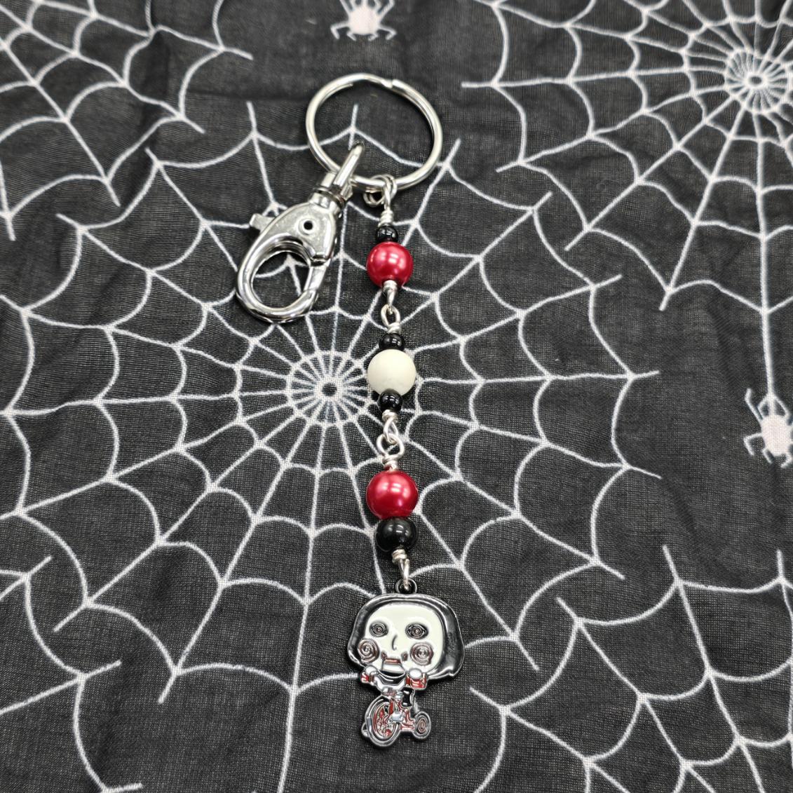 Horror Keychain, your favorite horror movie villain- single sided enameled black metal charm and hand wired with assorted black, red and white glass beads on split ring with claw clasp, 6 1/4"