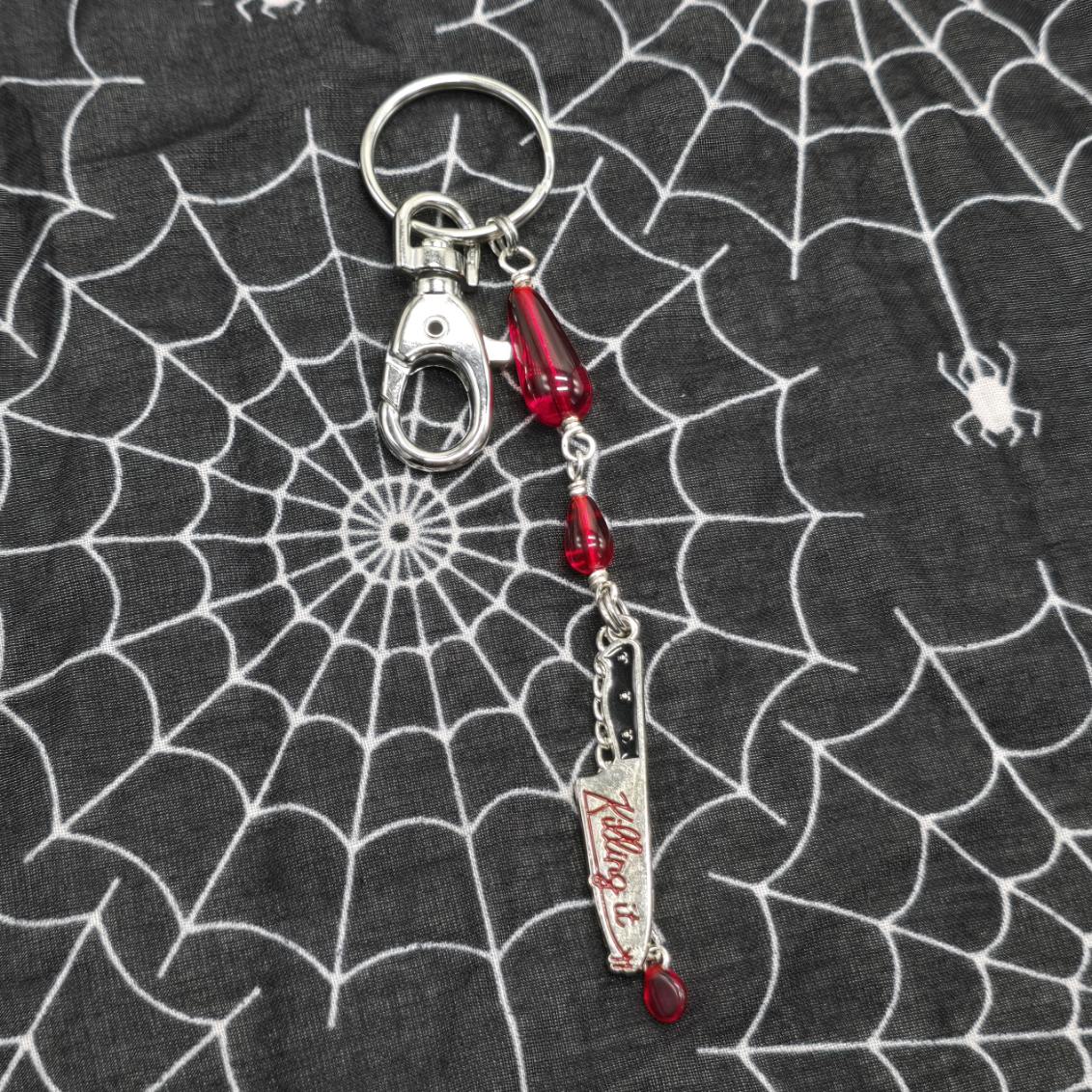 Killing It Keychain, ode to your favorite horror movie- single sided silver tone metal enameled charm, hand wired with red glass beads on split ring with claw clasp, 6"