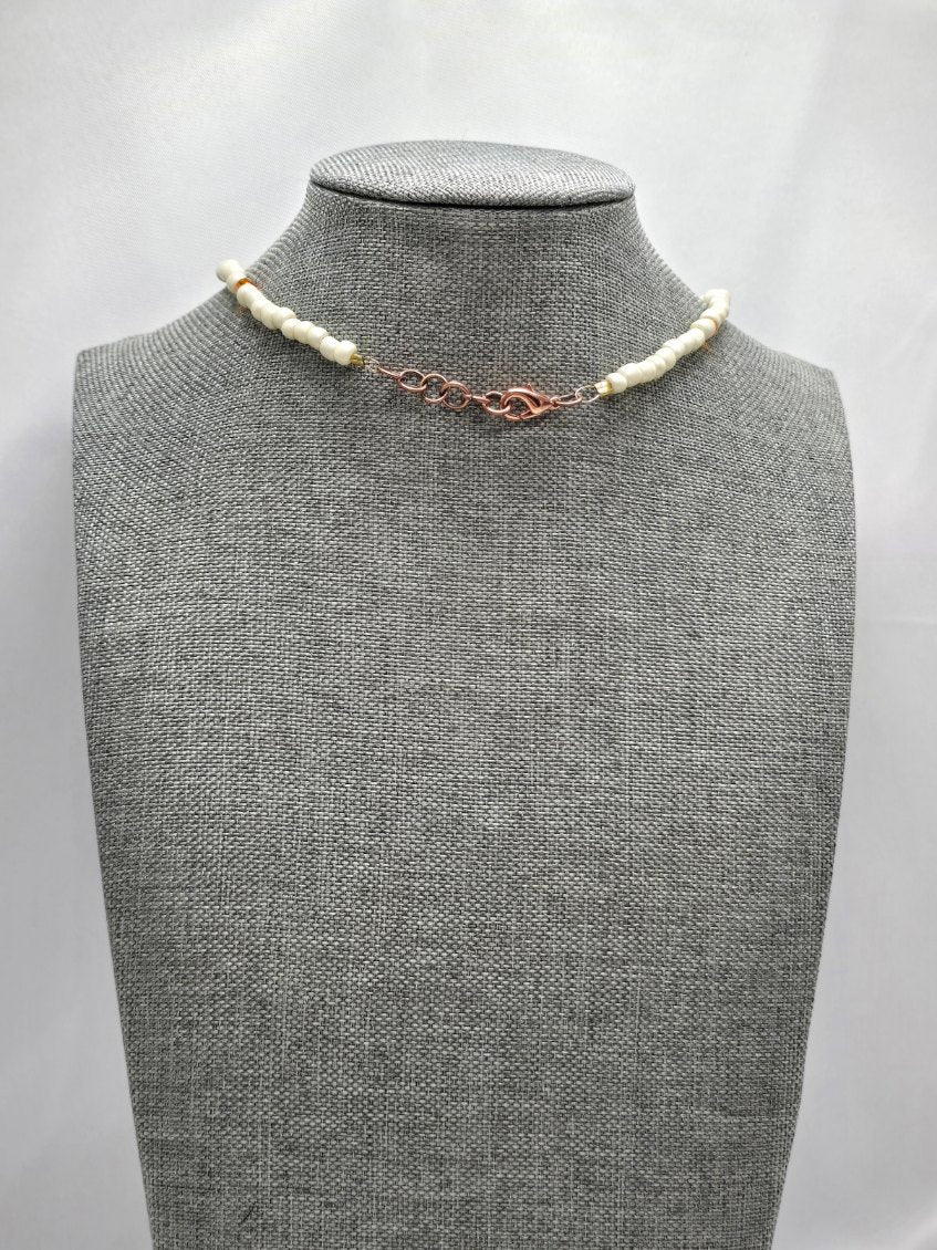 Halloween Necklace, single sided enamel, black zinc metal alloy charm with white iridescent and translucent orange glass seed beads, copper plated brass lobster claw clasp and copper plated steel adjustable links to 17"