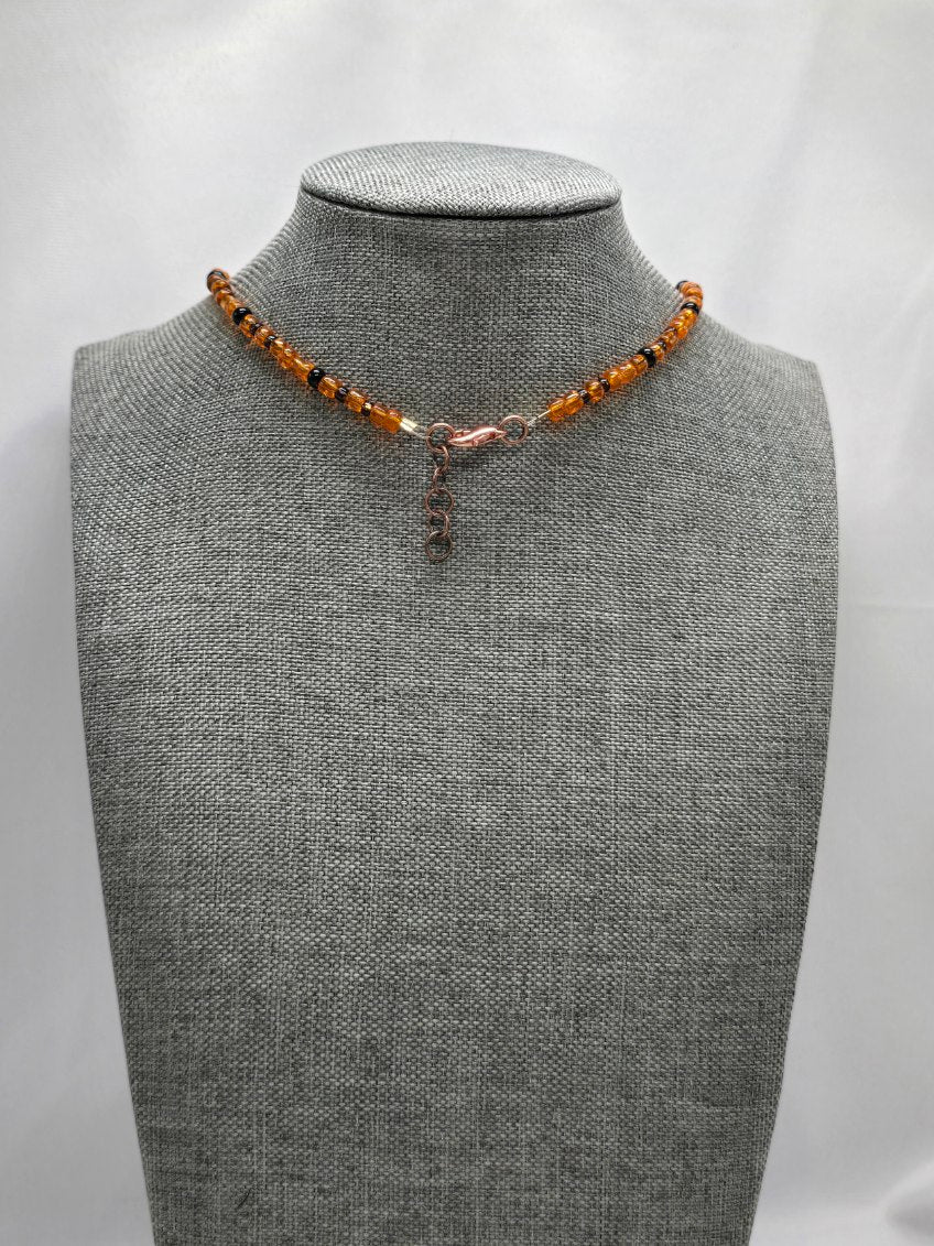 Halloween Necklace, single sided enamel, antiqued bronze zinc metal alloy cat charm with black and orange glass seed beads, copper plated brass lobster claw clasp and antique copper plated steel adjustable links to 17"