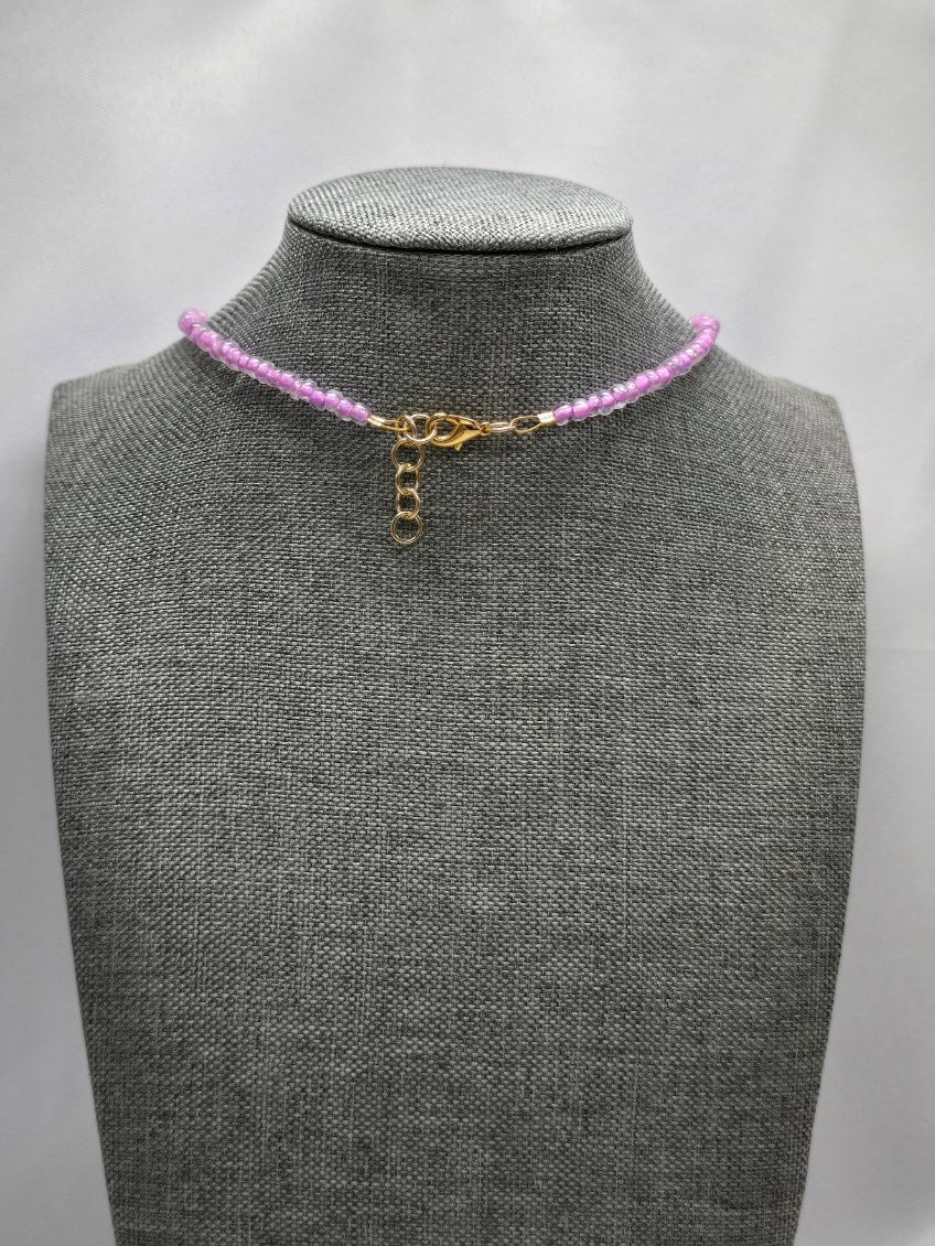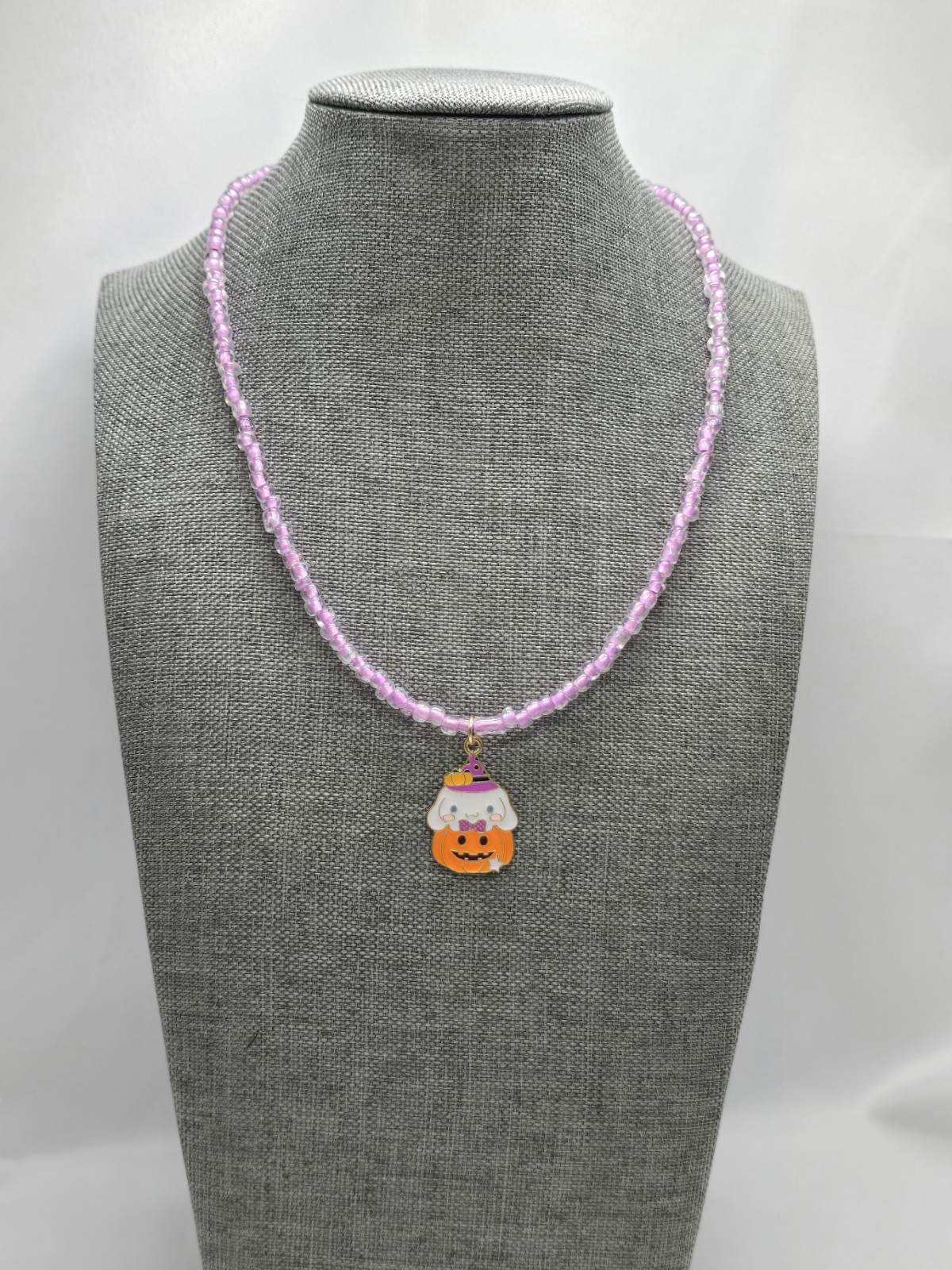 Halloween Necklace, single sided enamel, gold tone zinc metal alloy charm with pink glass seed beads and gold tone adjustable links, gold plated lobster claw clasp to 17"