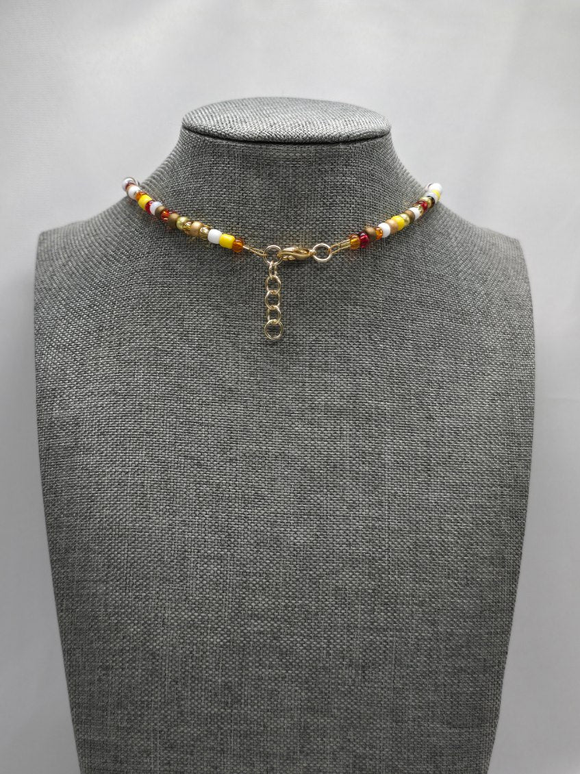 Fall Necklace, single sided enamel, gold tone zinc metal alloy charms with glass seed beads in fall colors with gold tone adjustable links and gold plated lobster claw clasp to 17"