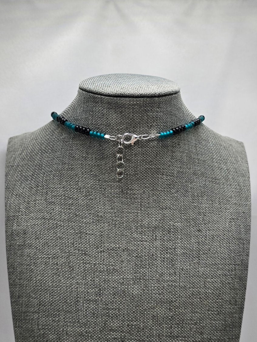 Halloween Necklace, single sided black enamel zinc metal alloy charm with blacka nd teal glass seed beads silver plated lobster claw clasp and  adjustable links to 17"