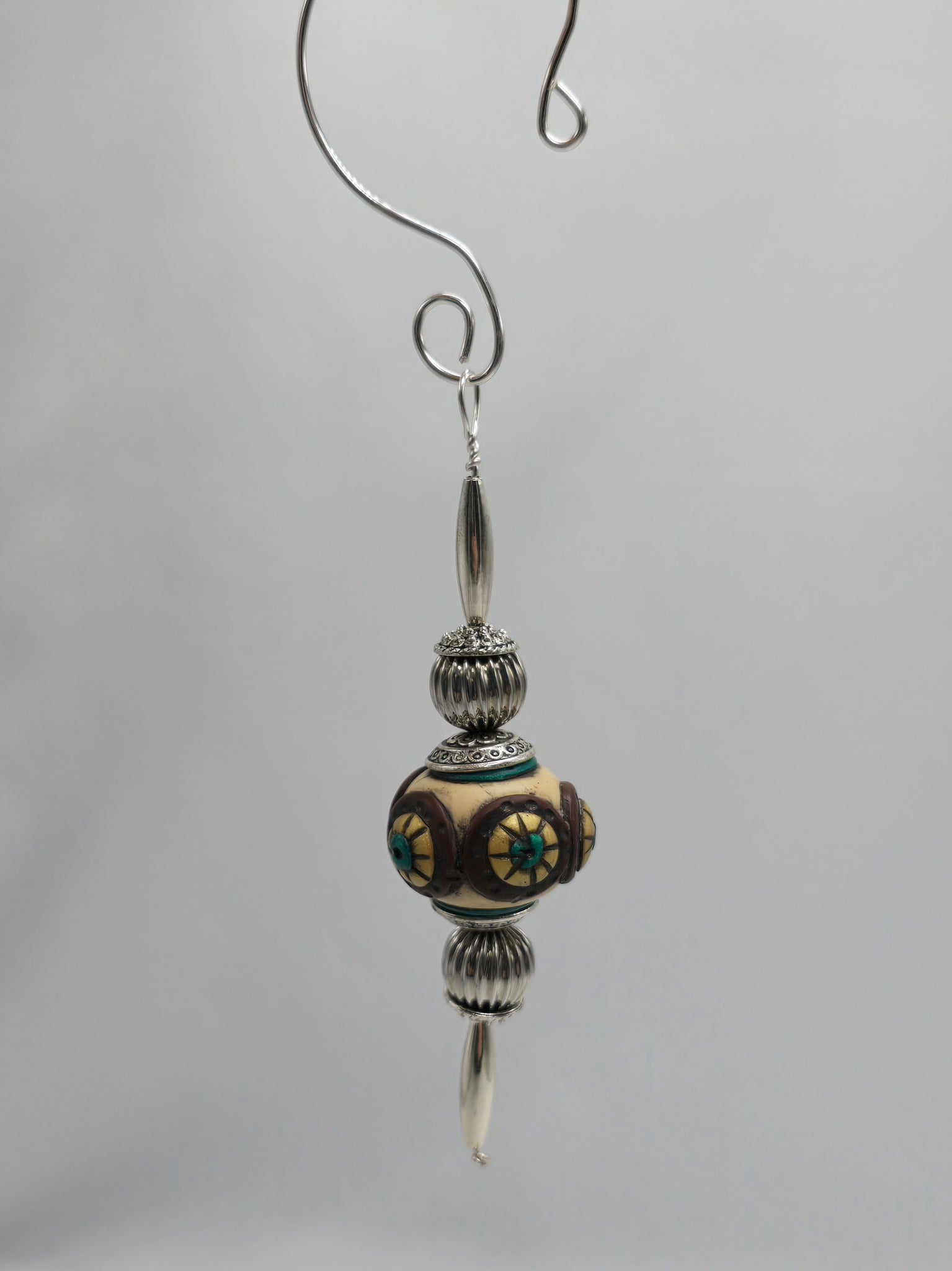 Beaded Ornament, one-of-a-kind hand wired ornament, handcrafted decorative hook, metal and handmade clay beads, overall length 5 1/2"