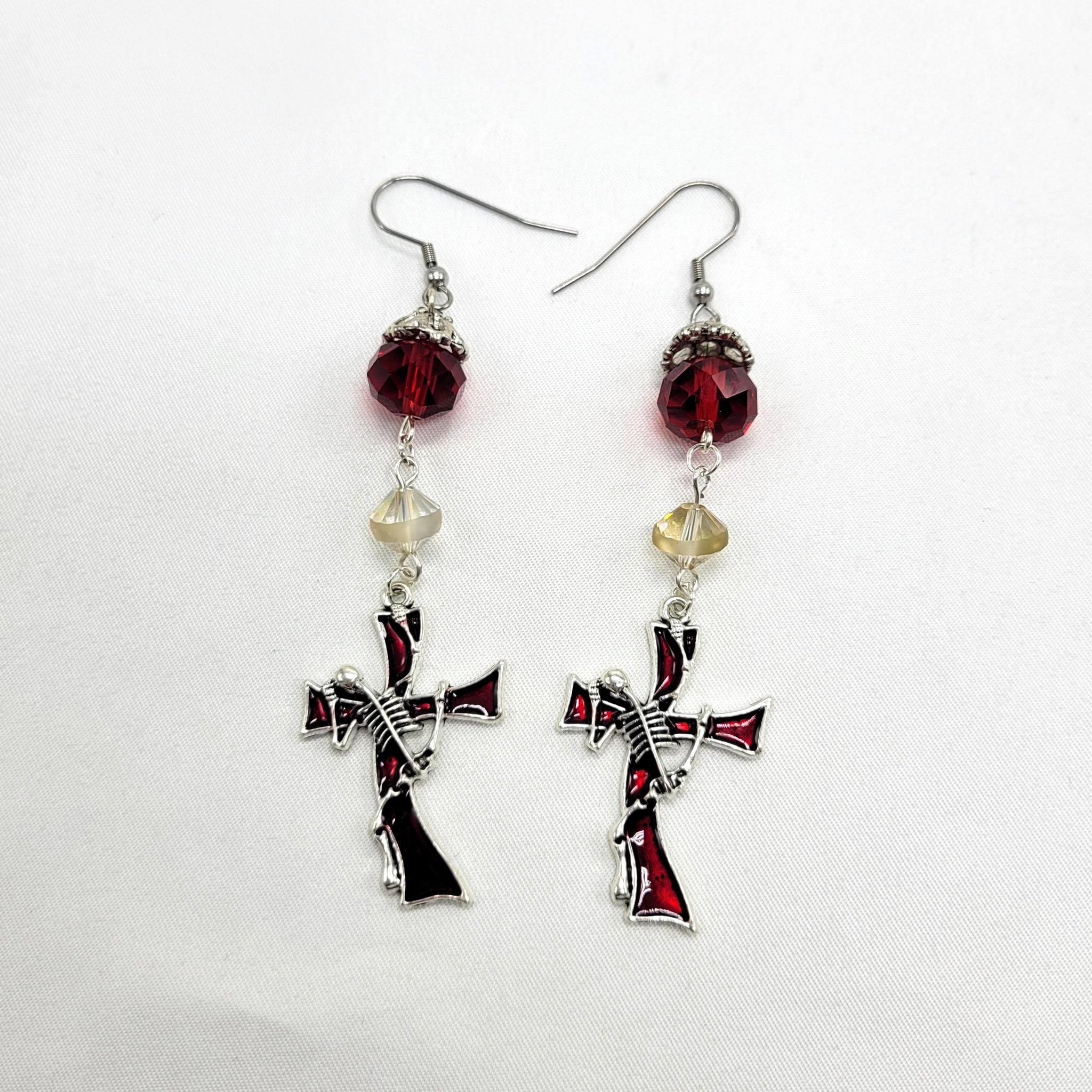 red enamel and silver tone cross (zinc metal alloy, lead and nickel free) with skeleton, faceted acrylic red and clear beads on 21g stainless steel, 17mm fishhook ear wire, 2 3/4"