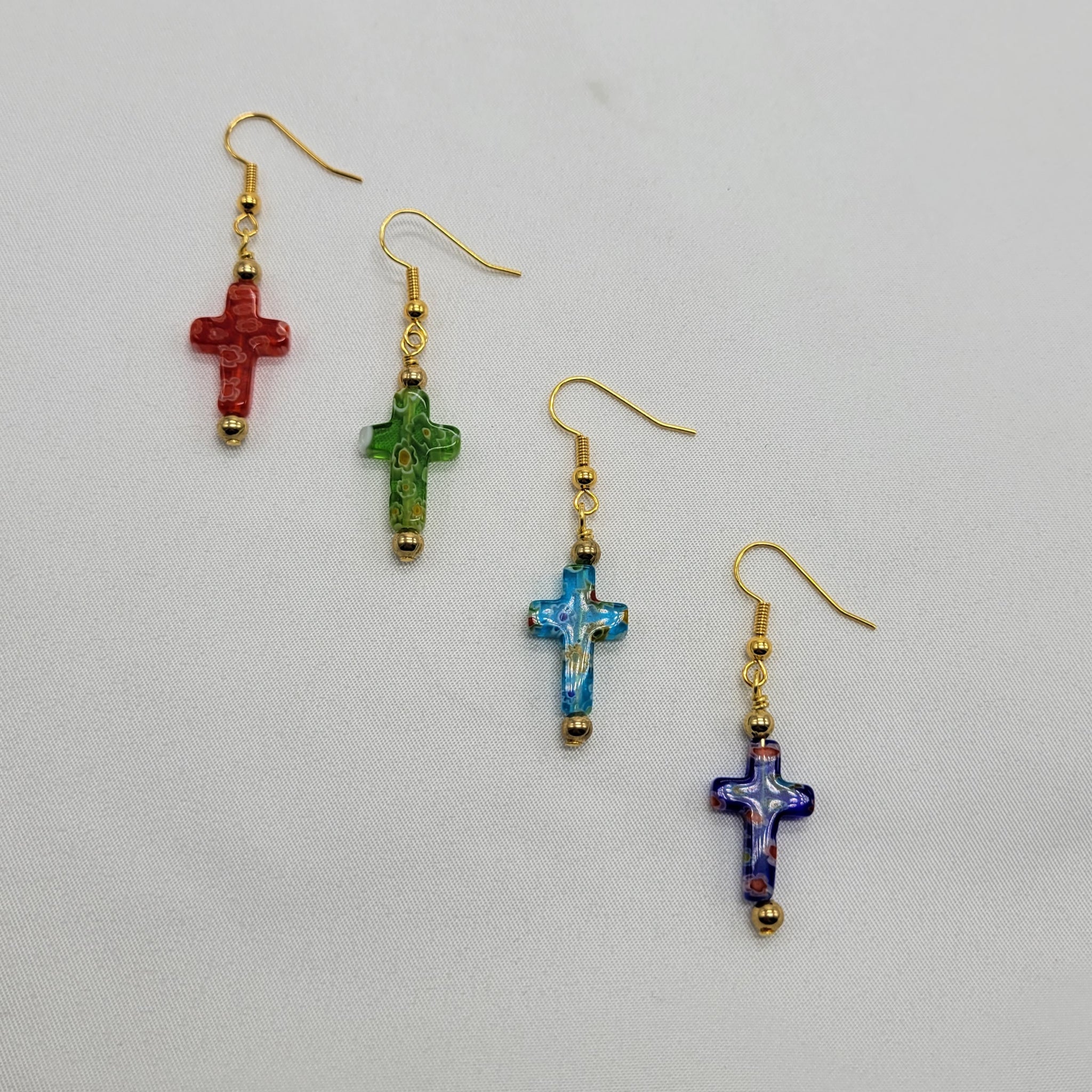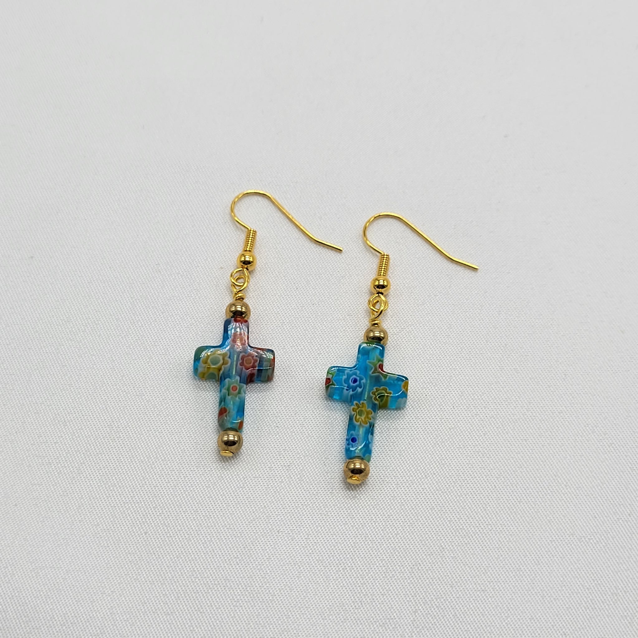 Glass Cross Earrings, flat millefiori glass cross with floral designs, 2 metallic gold tone mini beads on gold finished brass ear wire 4 colors available, 1 1/4"