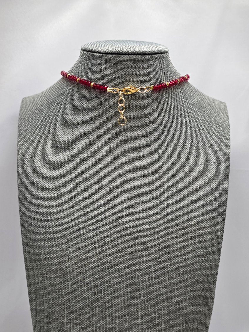 Halloween Necklace, single sided enamel, gold tone zinc metal alloy charm with red and gold glass seed beads, gold plated lobster claw clasp and gold tone adjustable links to 17"